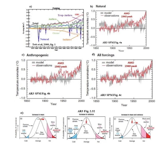 Un argument statistique vague, basé sur les changements de la distribution normale de la température, a relié les forçages « anthropiques » à l’augmentation de la fréquence et de l’intensité des « événements météorologiques extrêmes », comme le montre la figure 2e. La figure 2a est tirée de Tett et al, 2000. Les figures 2b à 2e sont tirées du TAR (l’AR3 est utilisé à la place du TAR dans la figure 3). Ce rapport a ignoré le pic évident des années 1940 lié aux phases de réchauffement de l’AMO.