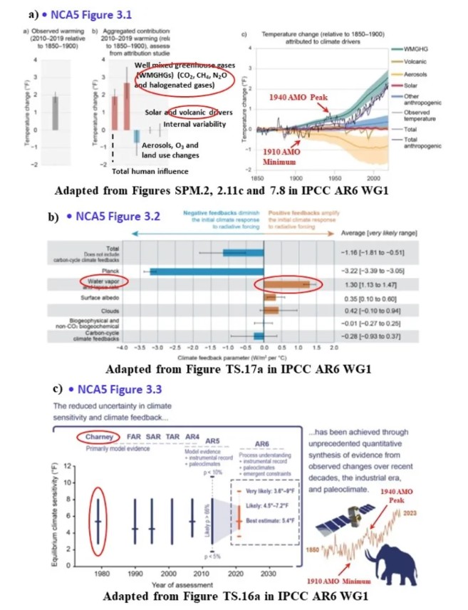 Les figures 3.1, 3.2 et 3.3 du chapitre 3, « Earth System Processes » (Processus du système terrestre), illustrent les forçages radiatifs, les rétroactions et les sensibilités climatiques utilisés dans les modèles climatiques qui justifient à tort les affirmations relatives aux conditions météorologiques extrêmes présentées dans le NCA5. Ces figures, adaptées du sixième rapport d’évaluation climatique du GIEC (AR6, 2021), apparaissent sous les numéros 3a, 3b et 3c.