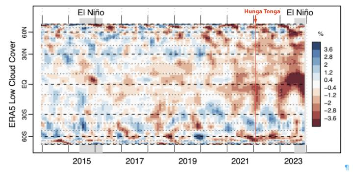 - La plus grande anomalie de couverture nuageuse basse jamais enregistrée à l’échelle mondiale s’est produite en 2023. [12]