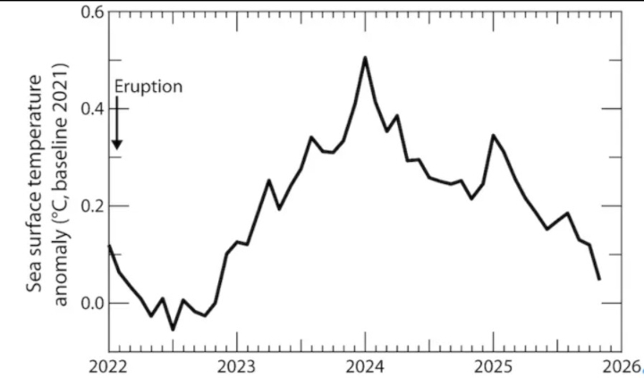 Pour celles et ceux qui ne sont pas convaincus que le changement climatique s’explique par les propriétés radiatives des gaz à effet de serre, l’éruption du Hunga Tonga constitue actuellement la meilleure explication de l’événement climatique de 2023. En juillet 2025, j’ai analysé que « si le Hunga Tonga est responsable du réchauffement de 2023-2024, on peut prédire clairement que la majeure partie de ce réchauffement devrait disparaître dans les 3 à 5 ans » [21] . Cette projection ne découle d’aucune autre cause envisagée. En décembre 2025, quatre ans après l’éruption, cette prédiction s’est avérée exacte : l’anomalie de température océanique en novembre n’était supérieure que de 0,05 °C à celle de novembre 2021, avant l’éruption. 90 % du réchauffement océanique dû à l’événement climatique de 2023 a disparu.