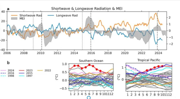 Bien que Minobe et al. (2025) soutiennent l’implication d’ENSO dans les événements survenus, ils avancent des arguments supplémentaires. [13] Premièrement, ils démontrent que le réchauffement exceptionnel de 2023 a débuté dans l’océan Austral en novembre 2022, soit quatre mois avant le réchauffement du Pacifique tropical et le début d’El Niño. Une conséquence ne peut précéder sa cause. Deuxièmement, ils démontrent que l’anomalie du déséquilibre énergétique terrestre entre 2022 et 2023 était supérieure de plus de 75 % à celle observée lors du début d’épisodes El Niño récents similaires. Cet événement sans précédent a d’abord affecté la haute atmosphère et a débuté en 2022. De plus, l’ensemble des indicateurs atmosphériques et océaniques inclus dans l’indice multivarié El Niño (MEI) suggère que l’épisode El Niño de 2023 n’était pas particulièrement intense. Un épisode El Niño, comme beaucoup d’autres, ne peut pas provoquer un événement sans précédent.