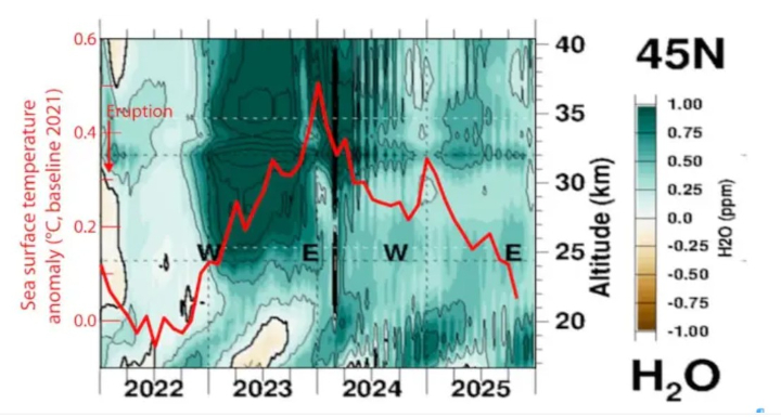 Les modèles climatiques ne reproduisent pas correctement les effets de l’éruption du Tambora de 1815, ce qui suggère que les changements atmosphériques dynamiques causés par des éruptions stratosphériques ou d’autres facteurs ont un impact bien plus important sur le climat qu’on ne le pensait auparavant. Il est frappant de constater que l’évolution de l’anomalie de température océanique coïncide généralement avec celle des anomalies de vapeur d’eau aux latitudes moyennes extratropicales de la stratosphère dans l’hémisphère Nord, mais pas dans l’ensemble de la stratosphère.