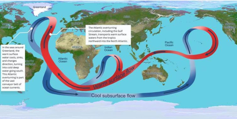 Il y a quelque temps, plusieurs articles alarmistes(Usbecetrica, geo.fr, Futura) [ont fait écho d’un possible ou probable effondrement de l’AMOC, « affaibli par le dérèglement climatique ». L’AMOC, ou circulation méridienne de retournement de l’Atlantique, peut être décrit comme un grand courant océanique qui transporte les eaux de surface chaude (dont le Gulf Stream) vers l’Arctique, où elles se refroidissent. Les eaux plus froides sont plus denses, et donc elles plongent dans les profondeurs de l’Atlantique Nord où elles sont alors entraînées vers le sud. Dans les scénarios les plus sombres, « si nous ne faisons rien », le réchauffement des eaux de surface, allié à l’apport d’eau douce de la fonte des glaciers Groenlandais pourraient ralentir ce grand tapis roulant et provoquer son arrêt, avec évidemment des conséquences gravissimes sur le climat de la Terre.