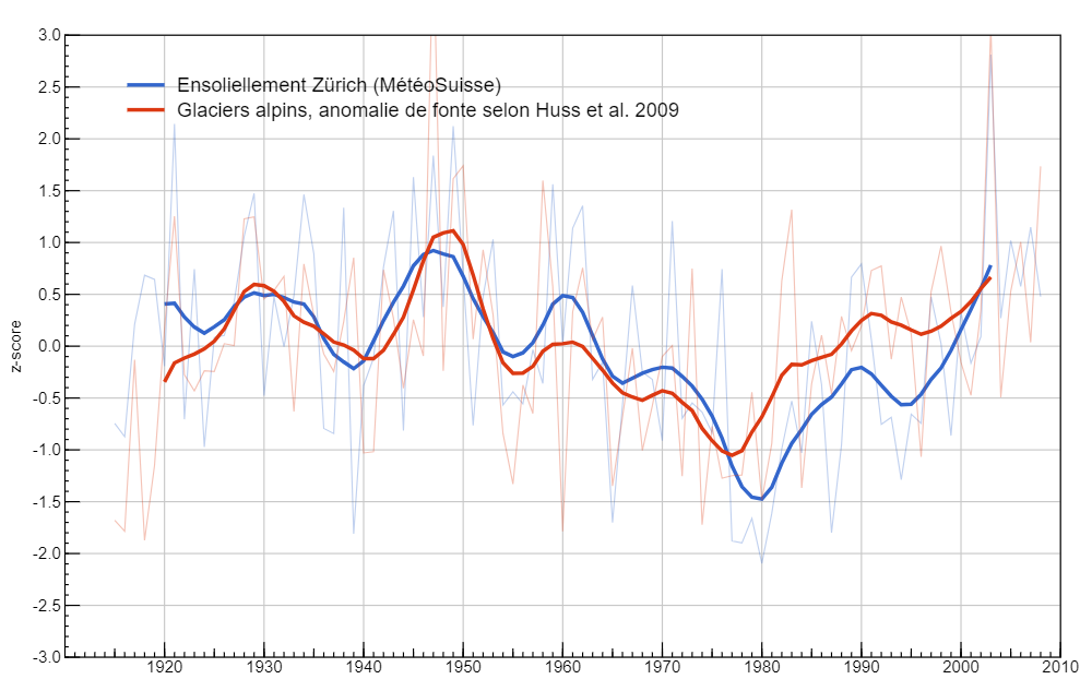 Votre graphique (tiré de Huss et al. 2009) n’y change rien : il compare l’ensoleillement à Zurich à la fonte de glaciers alpins. Qu’un glacier fonde davantage quand le rayonnement solaire augmente n’a rien de révolutionnaire. Cela montre simplement qu’un facteur local influence la fonte locale.